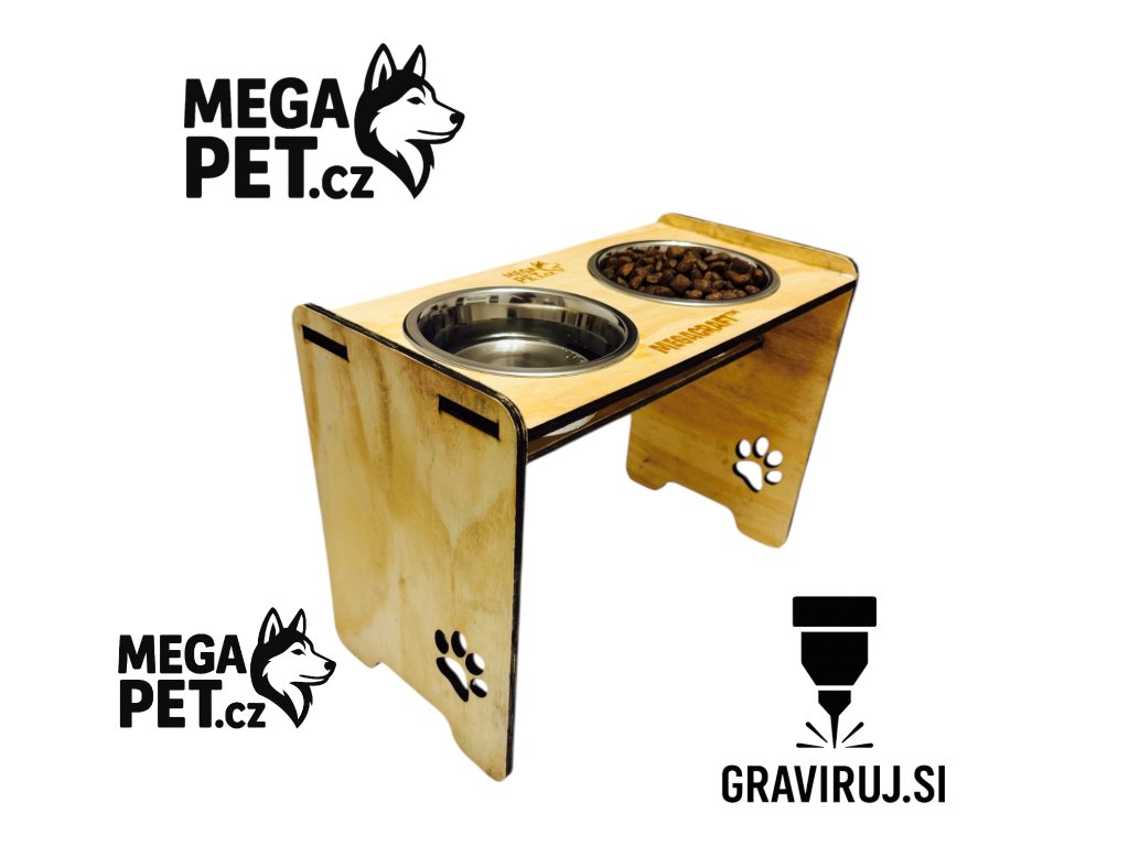 Stylový dřevěný stojan s nerezovými miskami od MEGAPET.cz! 🐾 Česká výroba, kvalitní zpracování a možnost gravírování jména tvého mazlíčka. ✨