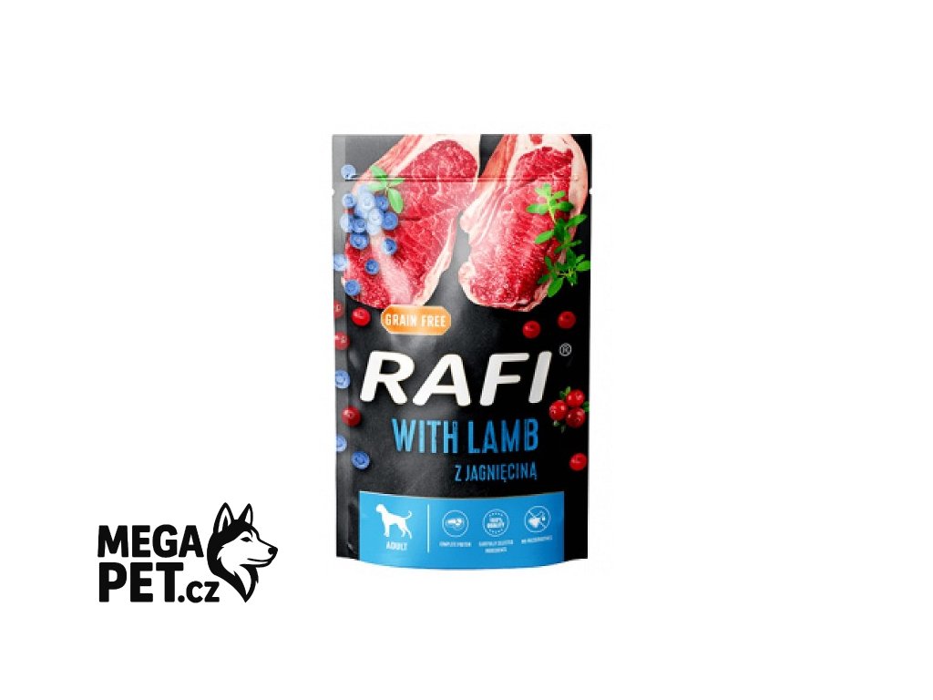 Krmivo, které pokryje 100% denní potřeby všech živin, minerálů a vitamínů pro vašeho pejska. Jehněčí maso je zdrojem zdravých bílkovin, vitamínů skupiny B a mnoha cenných mikro- a makroelementů, které podmiňují správné fungování dospělého psa. Mastné kyseliny n-3 a n-6 podporují přirozenou imunitu a také se podílejí na regulaci metabolických procesů. Mokré krmivo Rafi obsahuje správné poměry selenu a mědi. Přidání tymiánu zvyšuje senzorickou přitažlivost tohoto mokrého jídla. Jehněčí maso a suroviny jsou také zdrojem aminokyselin methioninu, isoleucinu a cystinu. Kvalitu krmiva zvyšuje obsah borůvek a brusinek, které jsou zdrojem mnoha cenných vitamínů a živin. Obsahuje zdravé bílkoviny a nenasycené mastné kyseliny, tj. základní složky pro správnou funkci pohybového aparátu psa, lněný olej, který je zdrojem n-3 a n-6 mastných kyselin, vitaminu E a řady biologicky aktivních sloučenin s protizánětlivými vlastnostmi, stejně jako cenné fytosteroly, které zlepšují fungování trávicího traktu, ovoce - borůvky a brusinky se silnými antioxidačními a protizánětlivými vlastnostmi, tymián, který stimuluje vylučování trávicích šťáv a dále zlepšuje chutnost psího jídla.